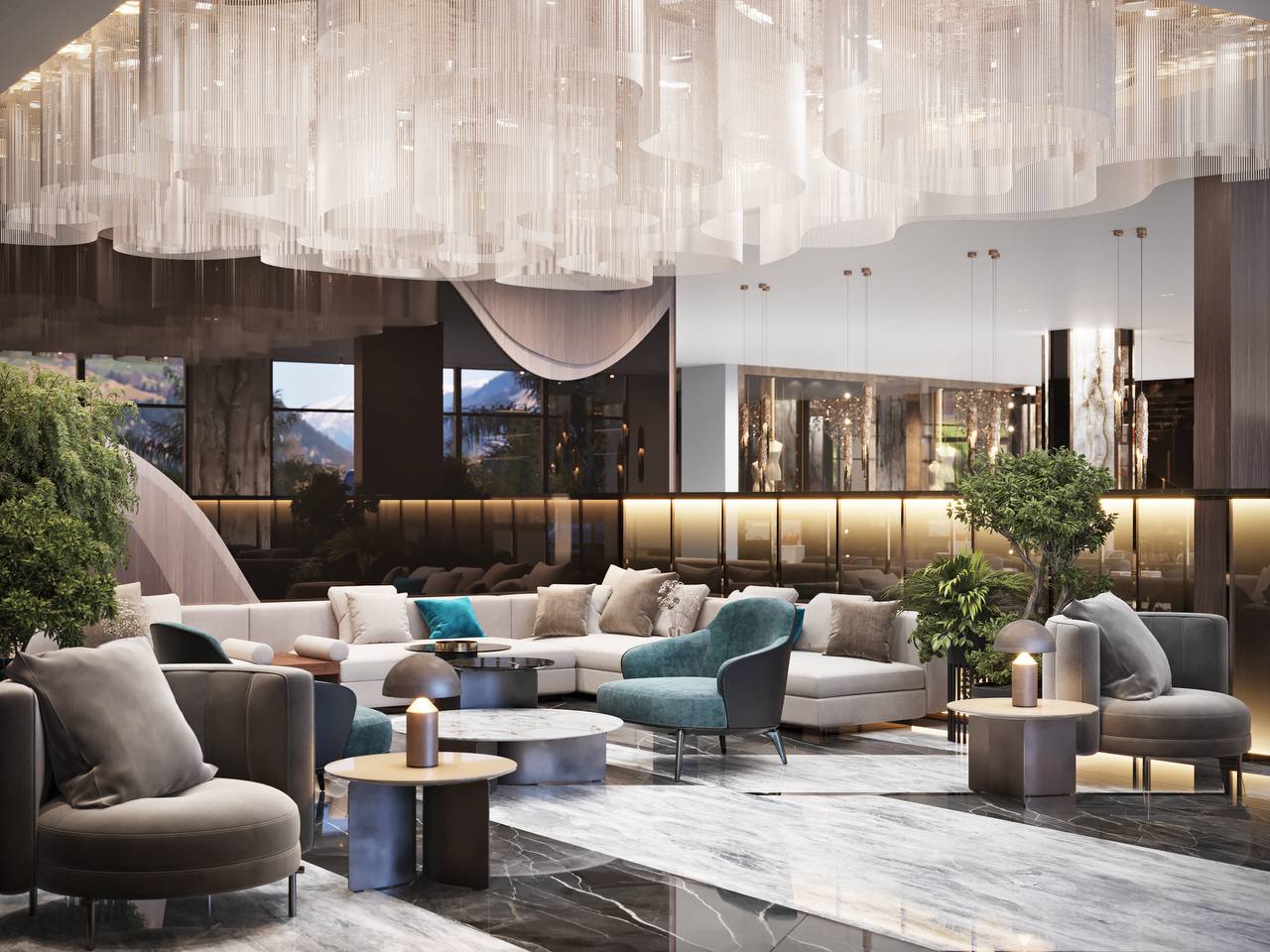 В Grand Hotel Marine Garden 5* первое впечатление создаёт впечатляющий дизайнерский вестибюль, разработанный экспертами Kaspary Interiors — международного архитектурного бюро с более чем 15-летней историей и членством в ASID и IIDA. Пространство оформлено исключительно изысканными материалами: натурального мрамора, редких пород дерева, тонированных зеркал и рифлёного стекла, дополненными декоративными элементами из латуни и меди. Акцентные вставки из оникса и кварцита придают залам глубину и игру света.
